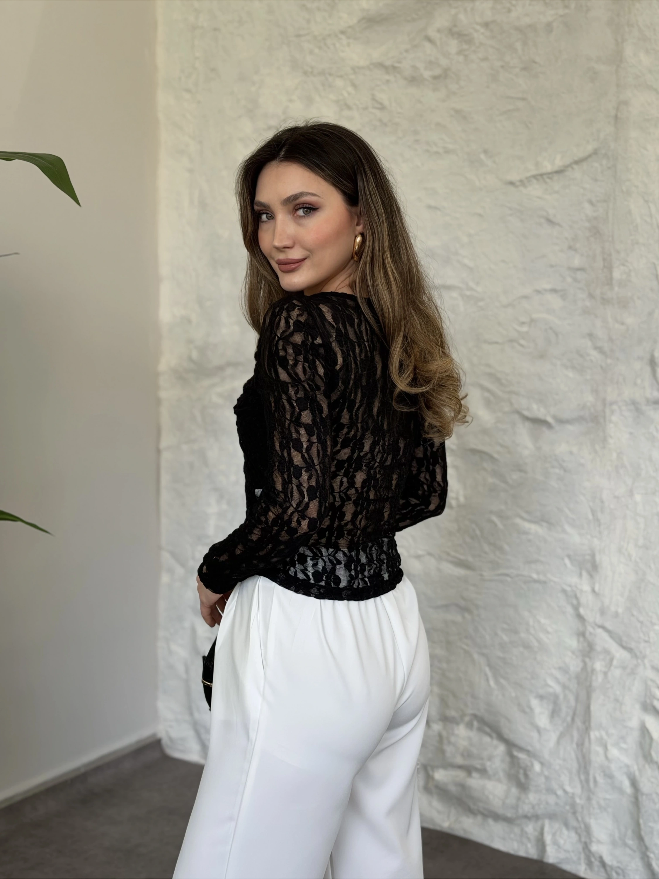Vatkali beli büzgülü dantel detaylı bluz siyah