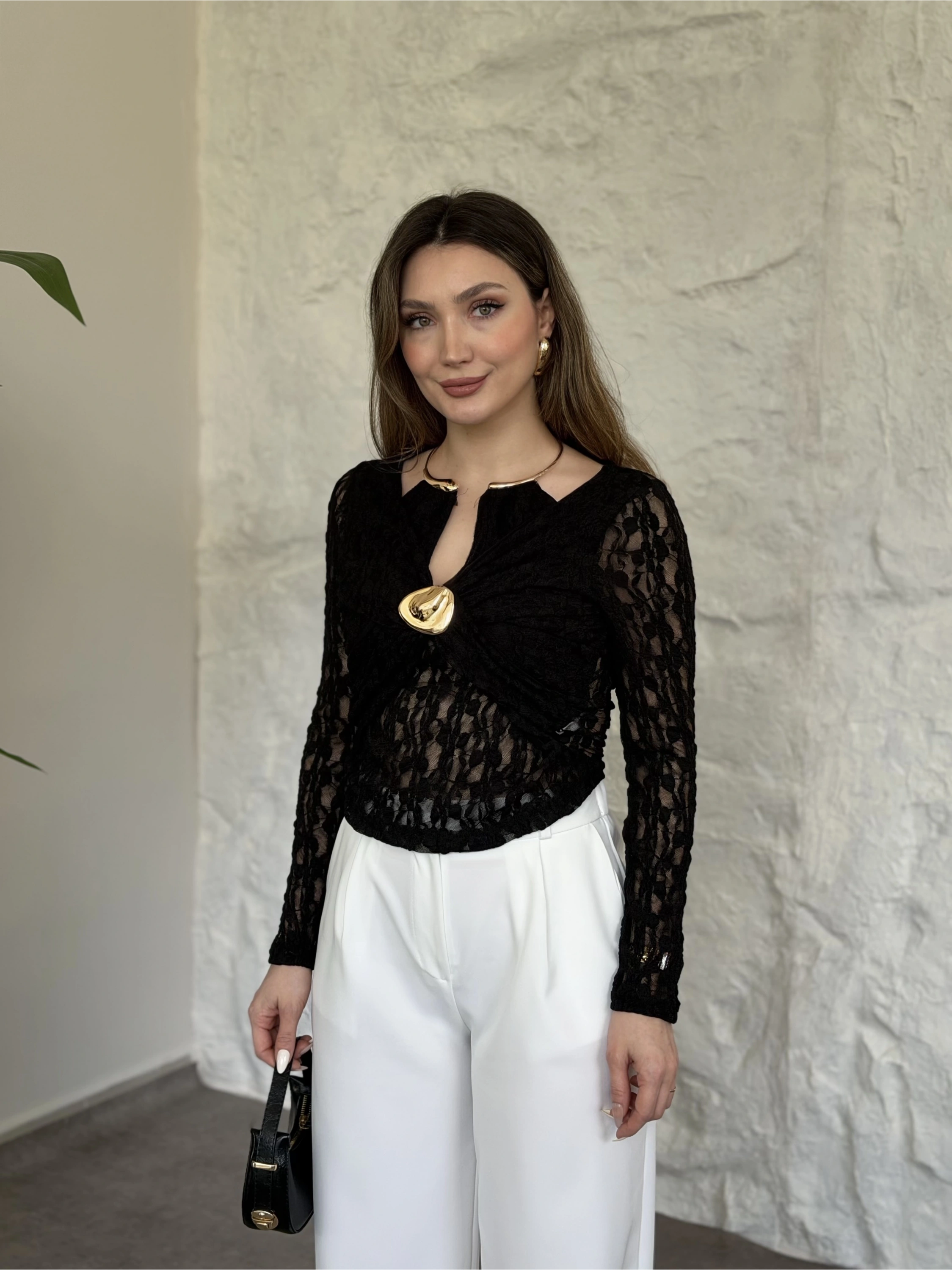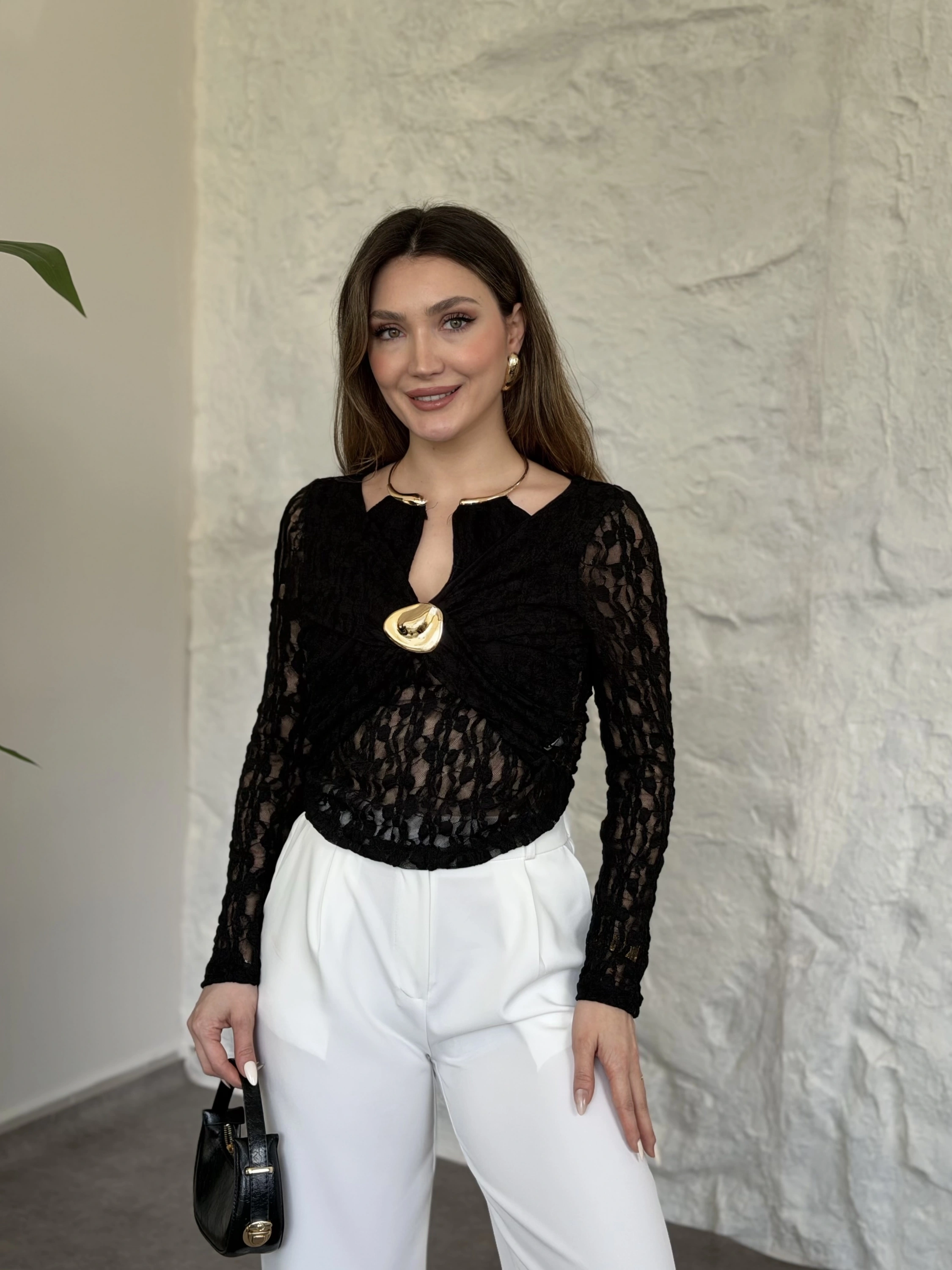 Yakası ve önü aksesuar detaylı dantelli bluz siyah