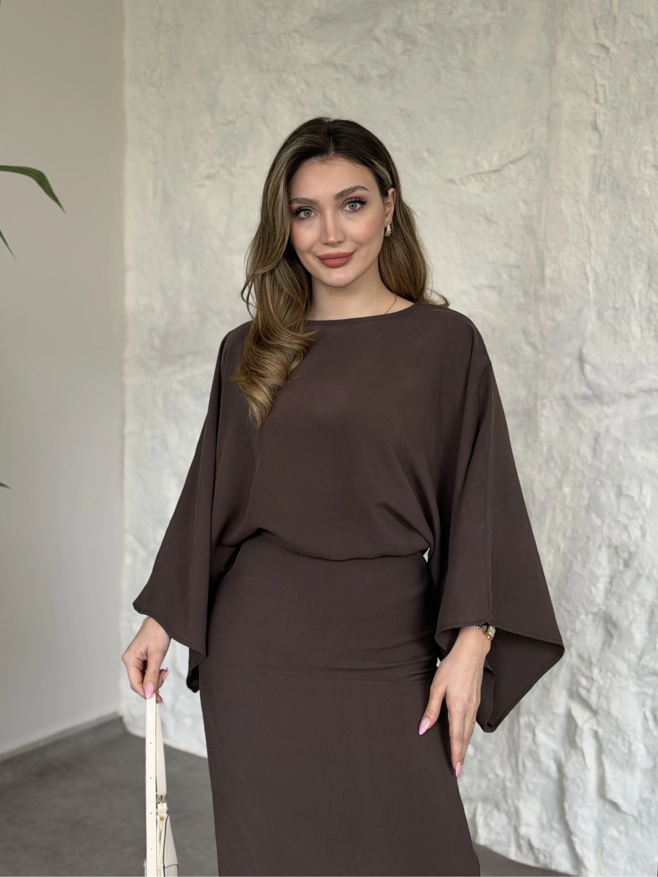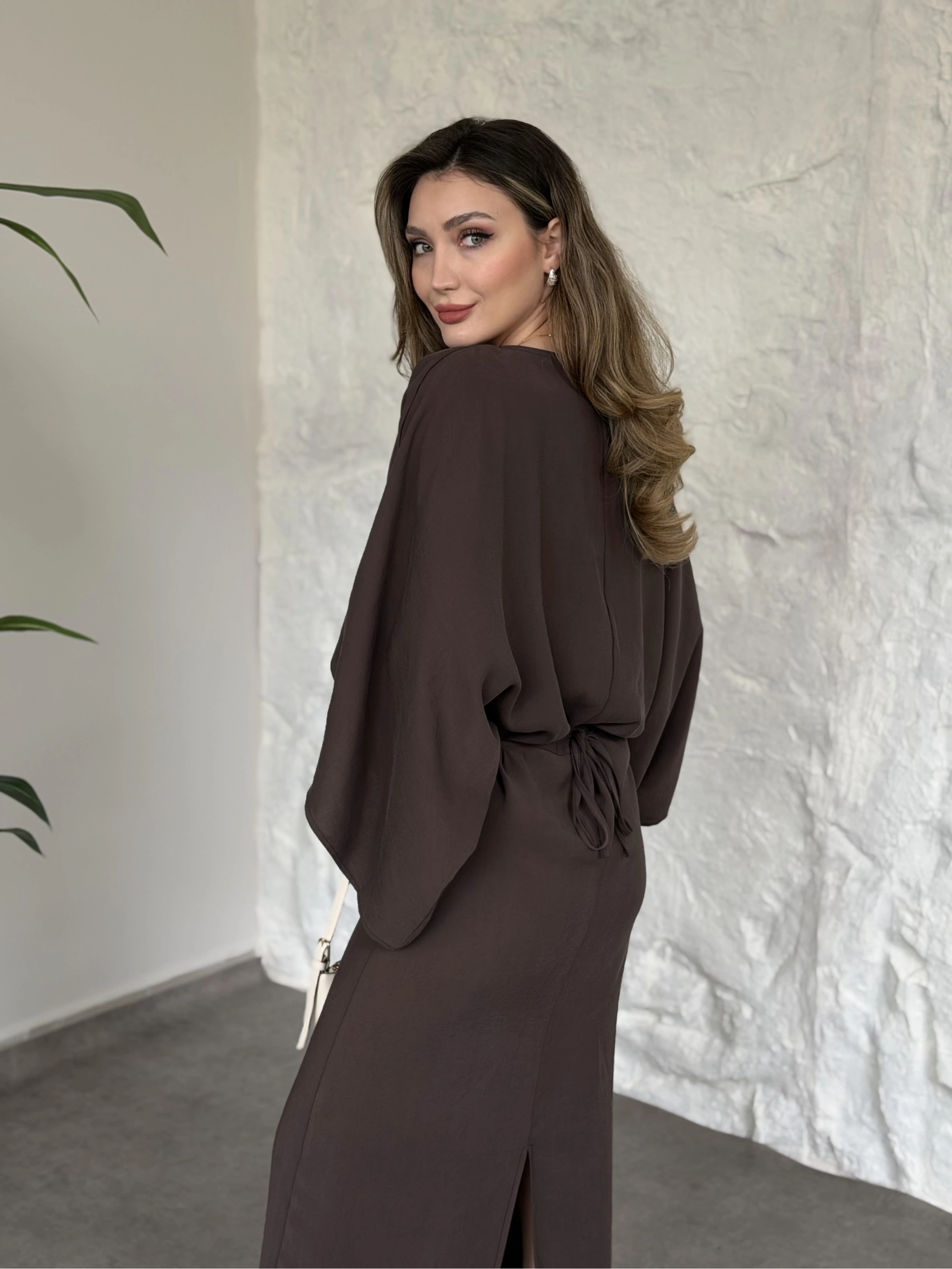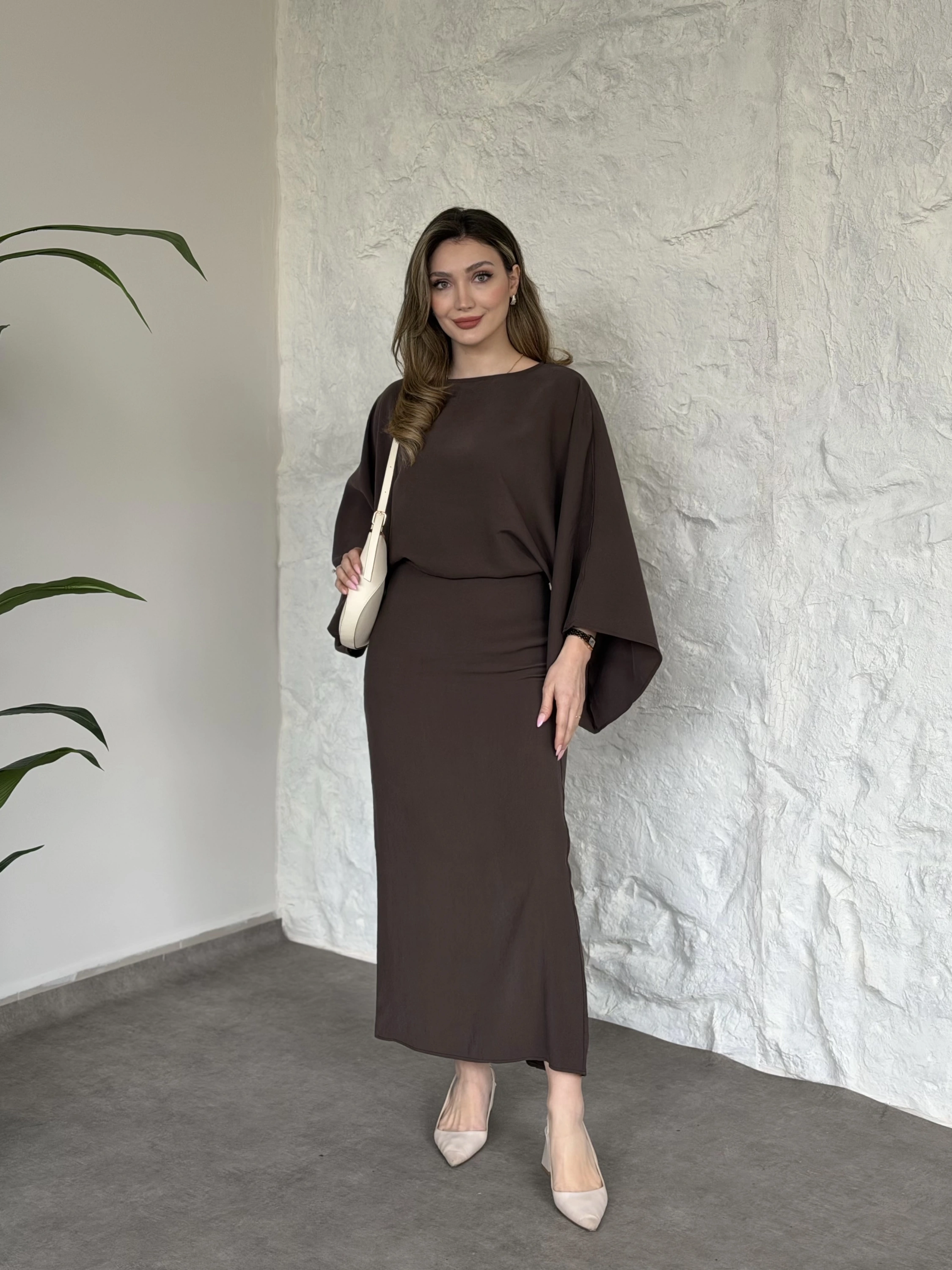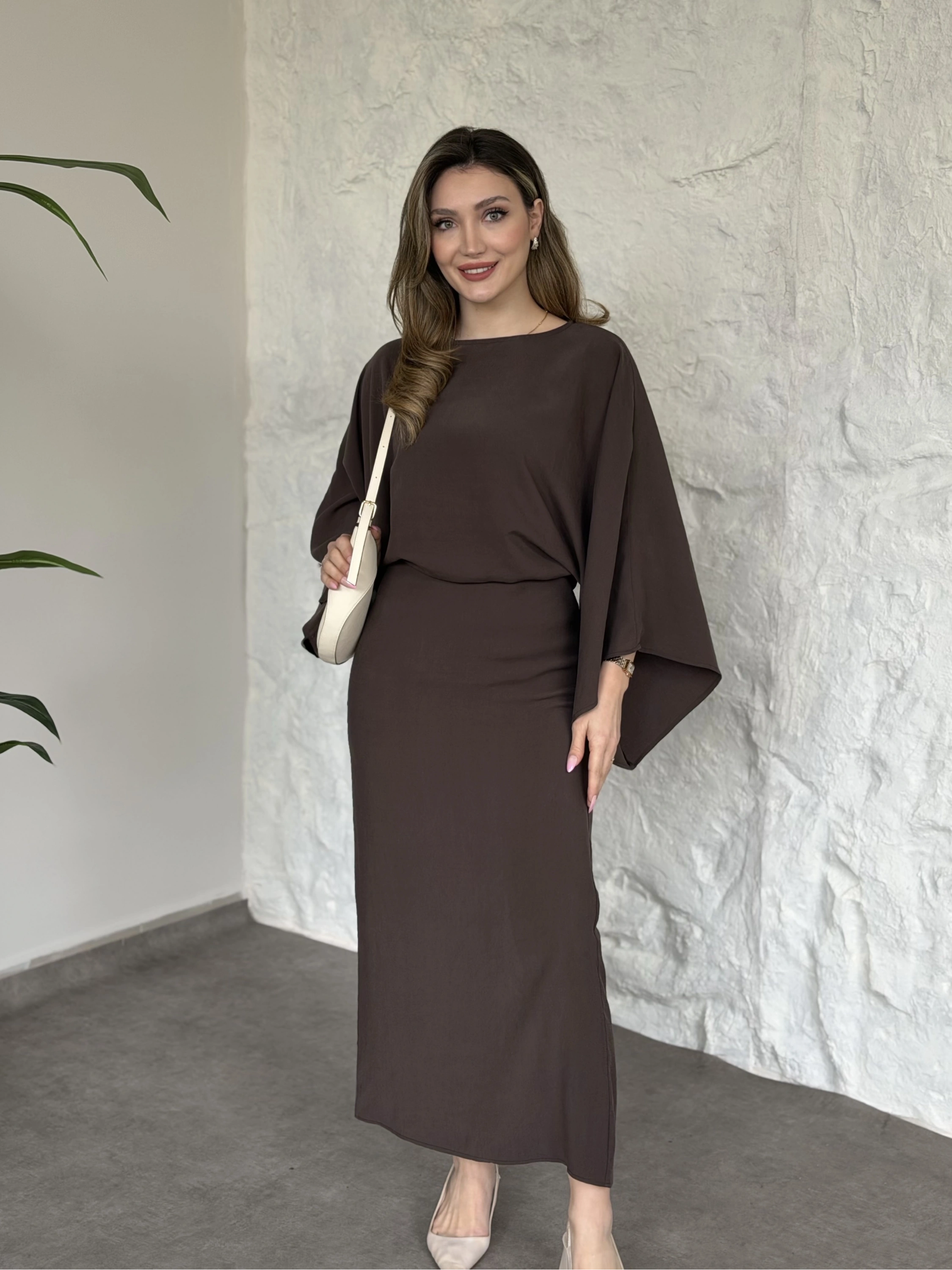 Yarasa kol maxi elbise kahve