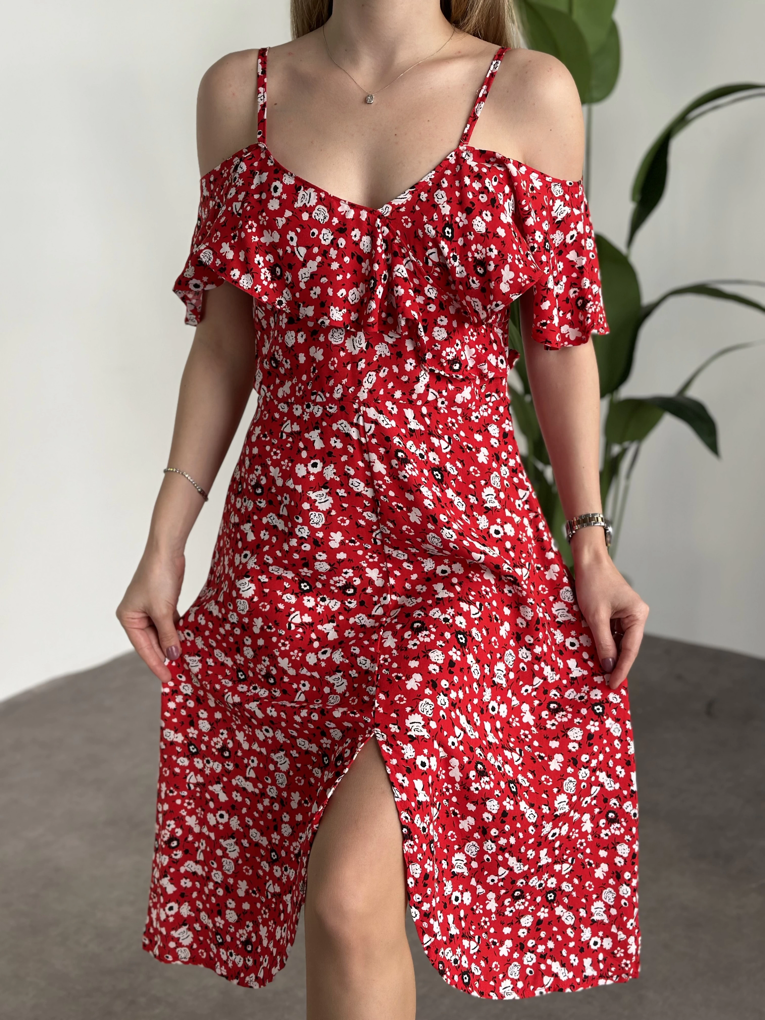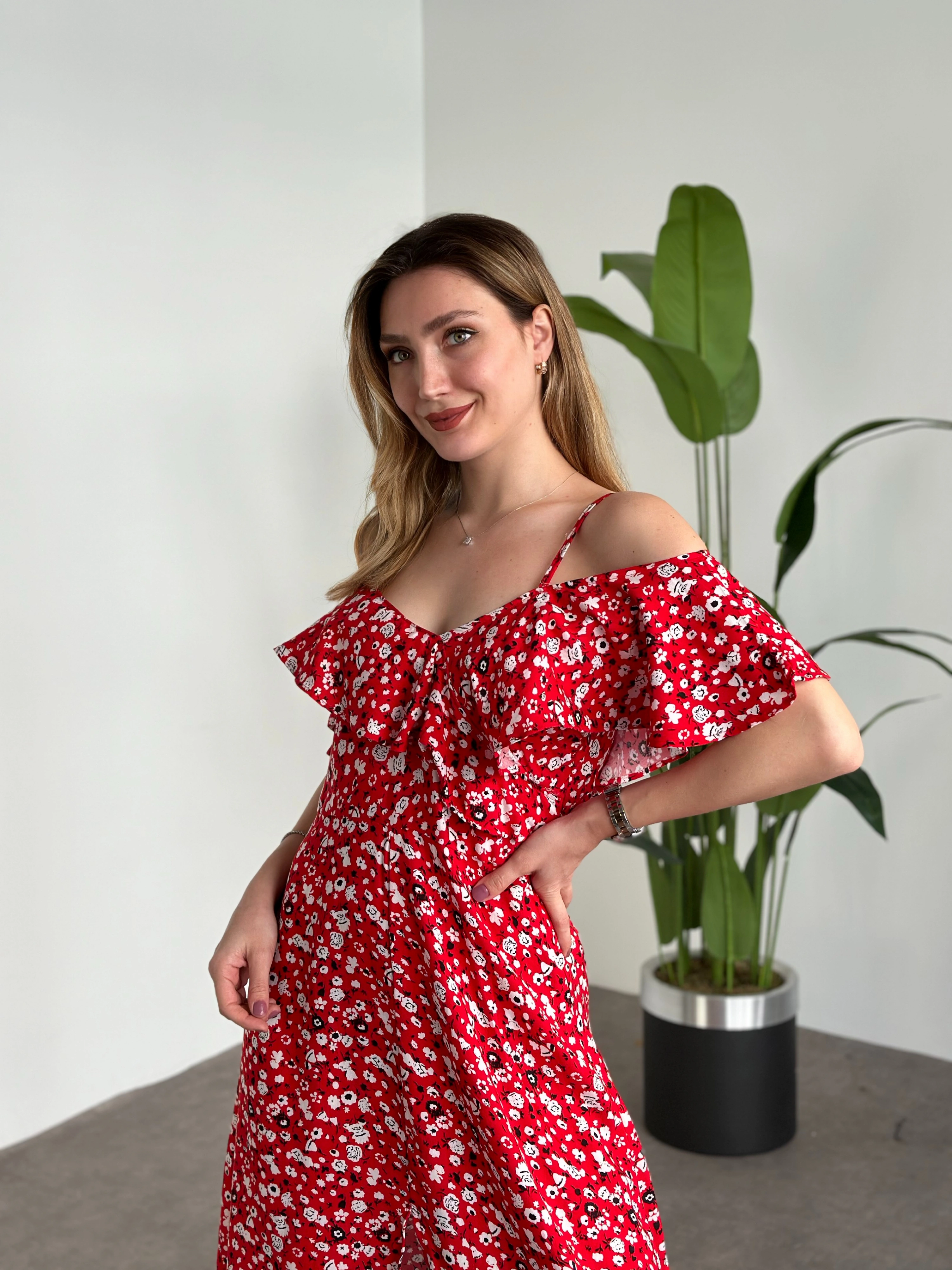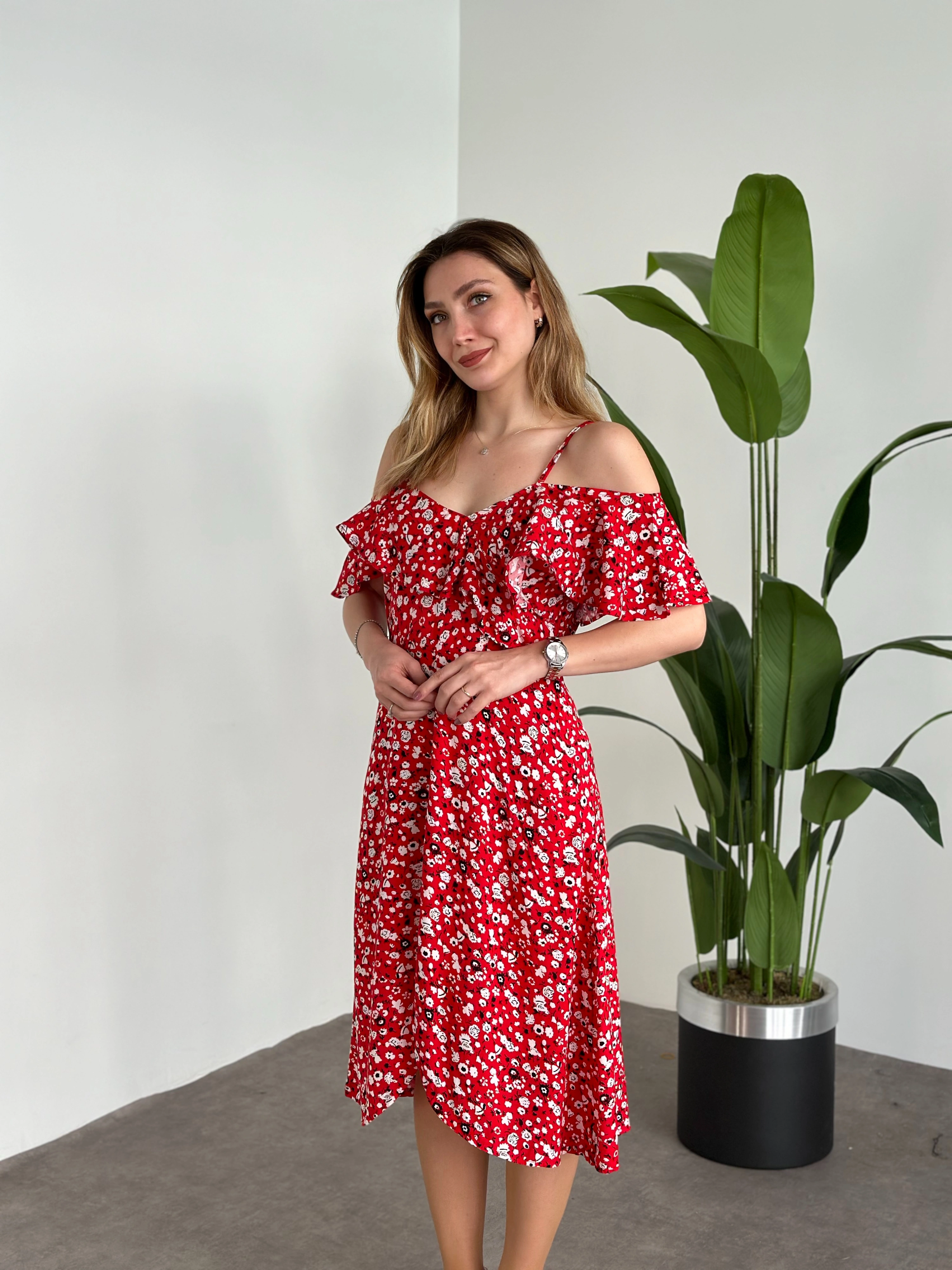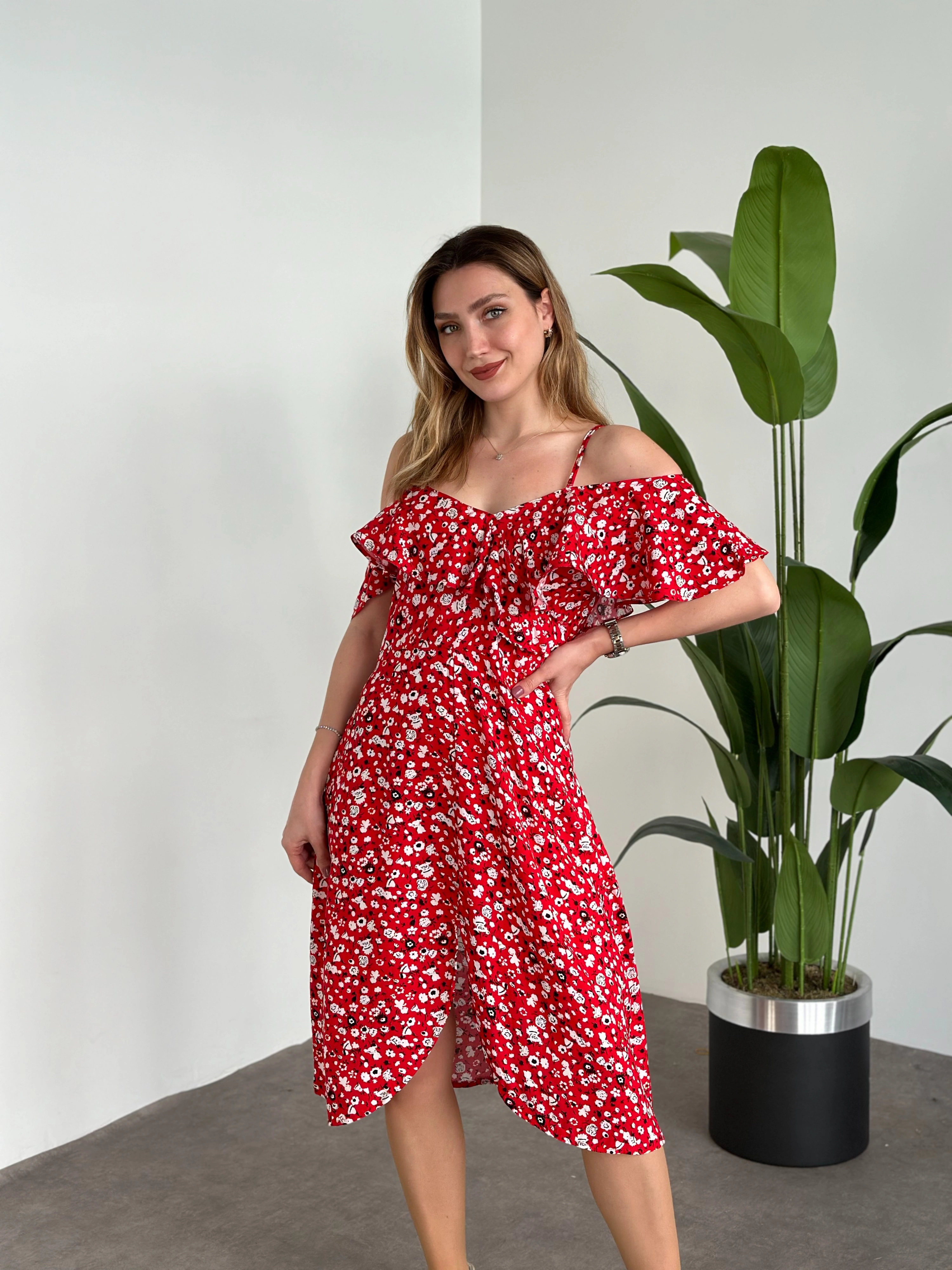 Yırtmaçlı Yakası İki Şekilde Kullanılabilir Pamuklu Viskon Elbise Kırmızı Beyaz Çiçekli