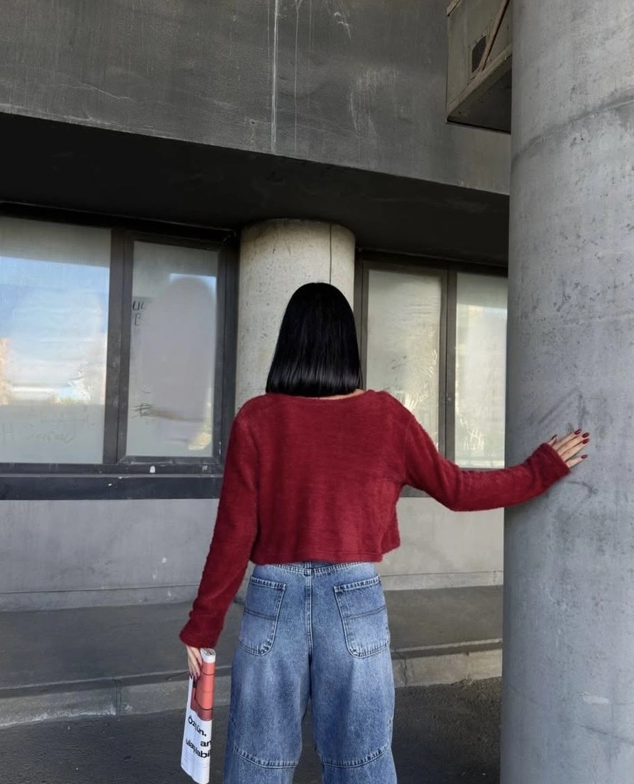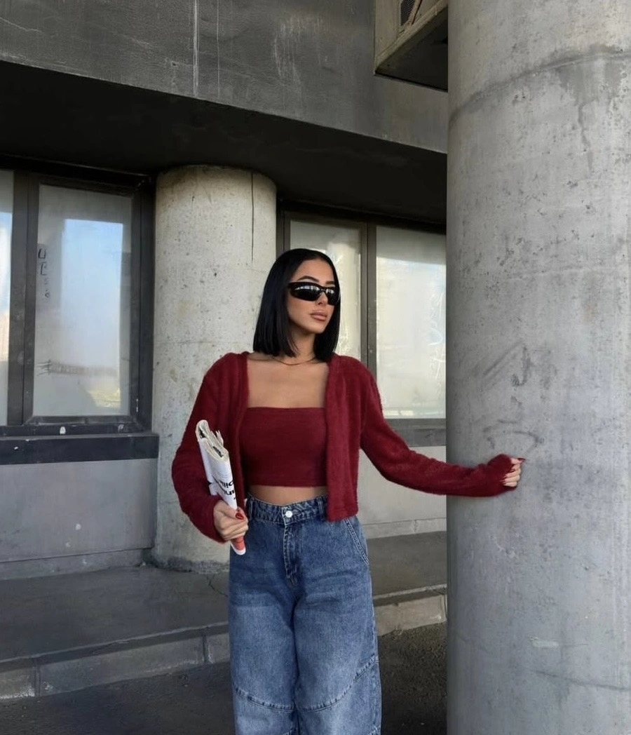 yumuşak tüylü askılı crop ve hırka bordo