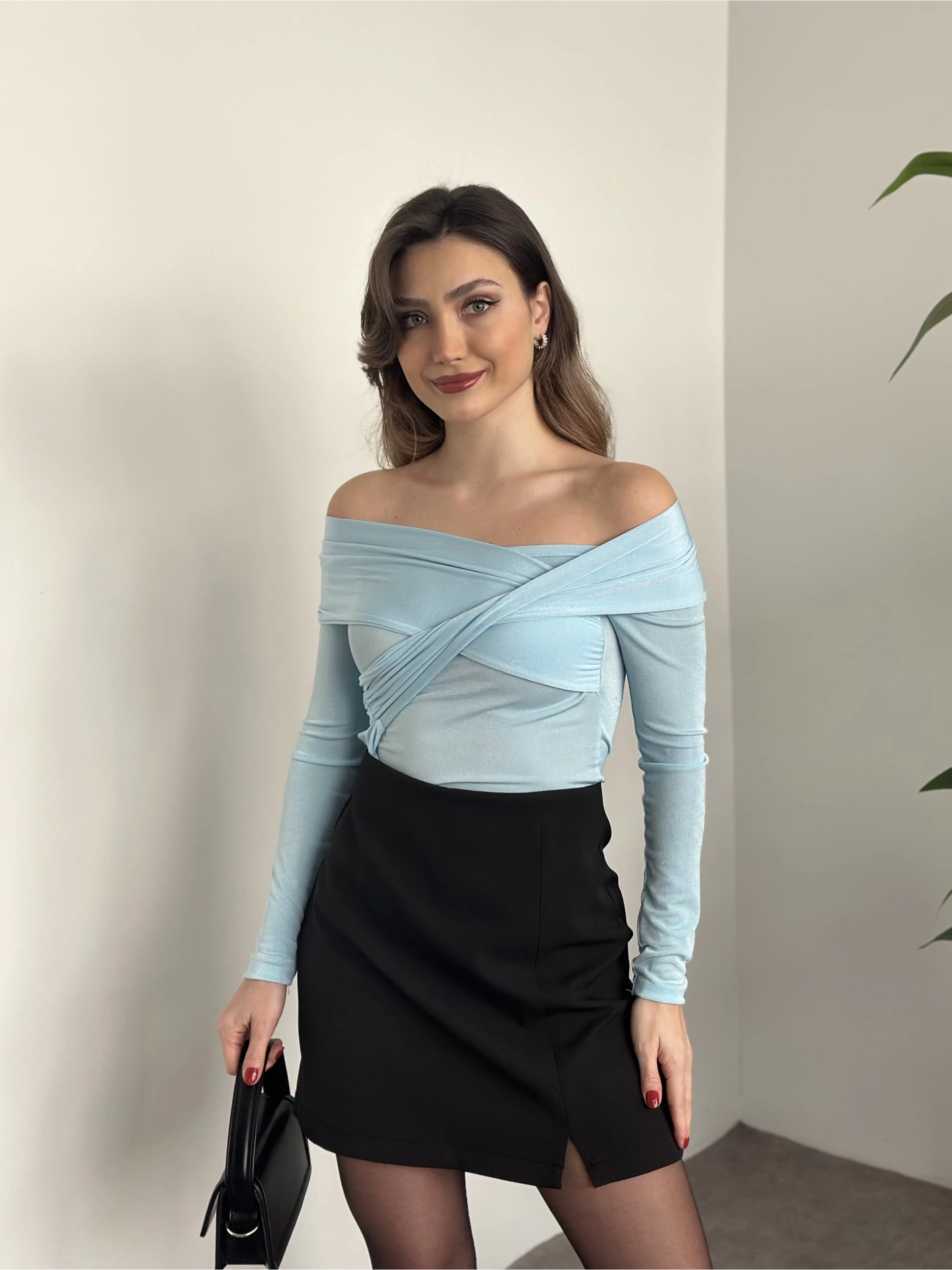 Belinden kuşaklı v yaka dabıl takım bebek mavisi